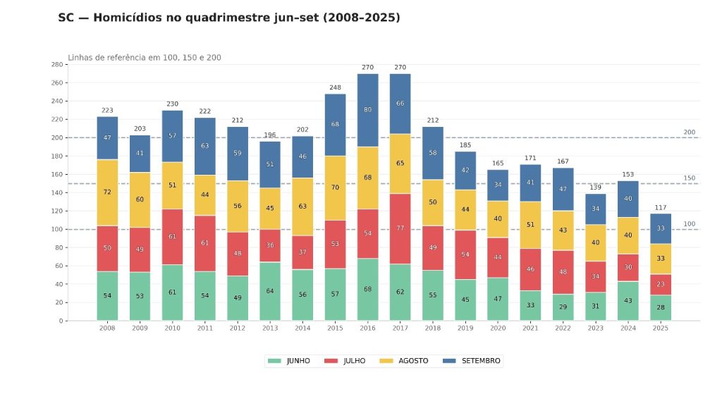 Os números de homicídios registrados em Santa Catarina, nos meses de junho, julho, agosto e setembro de 2025, representam os melhores resultados já alcançados em quase duas décadas para os respectivos períodos. Os dados fornecidos pela Diretoria de Inteligência Estratégica (DINE), da Secretaria de Estado da Segurança Pública (SSP-SC), confirmam a tendência de redução que vem se consolidando nos últimos anos. No primeiro semestre de 2025, o Estado já havia registrado o menor índice de homicídios de toda a série histórica para os seis primeiros meses do ano.