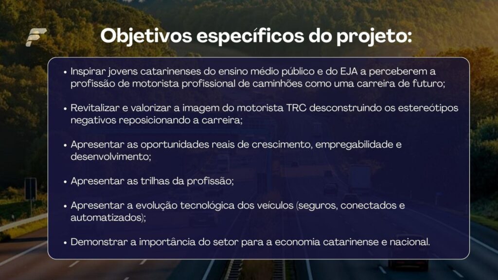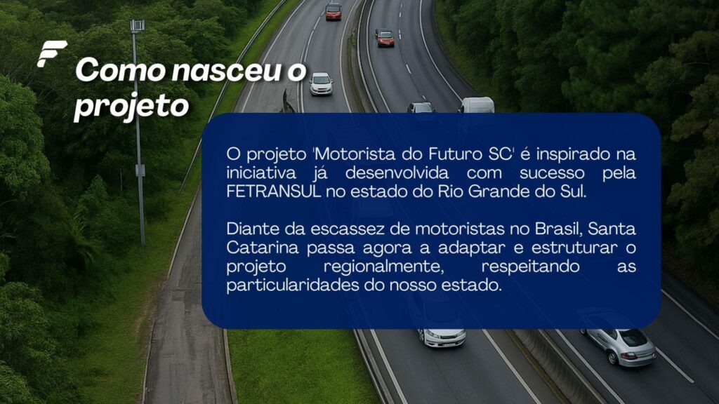 A Fetrancesc (Federação das Empresas de Transporte de Carga e Logística no Estado de Santa Catarina) firmou uma parceria com o Governo do Estado de Santa Catarina para atrair e preparar jovens para uma das mais importantes profissões: a de motorista de caminhão. Realizado pela Fetrancesc, com apoio do Sest Senat, o projeto Motorista de Futuro será levado a escolas públicas estaduais e Centros de Educação de Jovens e Adultos (CEJAs), com o intuito de formar uma nova geração de profissionais.